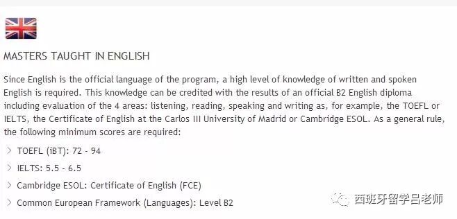 那么对于一些想要申请英语授课或是双语授课的同学,英语成绩的要求也是十分严苛的。虽然每个专业的要求会上下有所浮动,但是总体的要求卡洛斯三世大学也已经写在了官网上面。也就是要达到英语的B2水平,即雅思成绩5.5以上,托福成绩72分以上。对于想要进行双语课程的同学不要忘记了西班牙语的硬性要求Dele或者Siele在B2及以上呦~